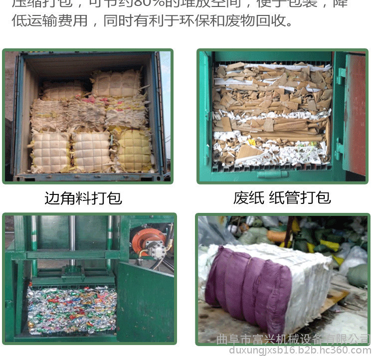 廢紙打包、棉花打包、服裝打包、秸稈打包、玉米芯、塑料打包、羊毛打包、可回收垃圾打包,邊角料打包,亦可應(yīng)用于棉、羊毛、廢紙箱、廢紙板、紗線、煙葉、塑料、布匹、編織袋、針織絨、麻、麻袋、毛條、毛球、繭、蠶絲、啤酒花、廢塑料袋等一切輕泡、松散物料等松軟類物料進(jìn)行壓縮打包,飲料罐和工業(yè)邊角料等包裝材料及廢品打包,節(jié)約達(dá)80%的堆放空間,降低運(yùn)輸費(fèi)用,同時(shí)有利于環(huán)保和廢物回收。