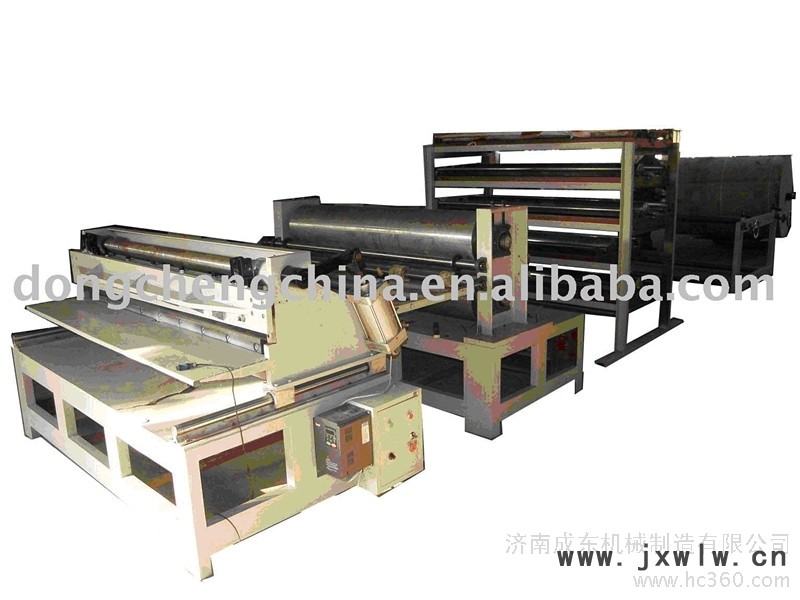 一、主要參數(shù):1、 復(fù)合凈紙寬度:1800mm2、 復(fù)合厚度: 2-3mm3、 復(fù)合層數(shù): ≤6層4、 放卷直徑:≤Φ1200mm5、 切割長(zhǎng)度: 1-6m(定長(zhǎng)切割)6、 放紙漲力控制: 氣動(dòng)剎車7、 控制方式:變頻調(diào)速8、機(jī)功率:5KW9、 涂膠方式:?jiǎn)蚊嫱磕z10、壓合方式:大直徑鋼輥壓合11、切斷方式:自動(dòng)跟蹤切斷,氣動(dòng)切斷12、定長(zhǎng)方式:光電開(kāi)關(guān)定長(zhǎng)13、設(shè)備重量:7噸二、主要配置1、 退紙架為三組退紙架,每組放倆個(gè)紙輥,高低錯(cuò)開(kāi),每個(gè)輥都帶氣動(dòng)剎車:漲力大小可調(diào)整2、 涂膠部分:5個(gè)膠槽滿足6層紙涂膠。每個(gè)膠槽帶施膠和刮膠裝置,上下面紙采用單面施膠;3、 壓合部分:采用雙鋼輥壓合,大直徑壓力大。壓力大小可調(diào)整??v切裝置固定在壓合后部,為上下圓刀切割;4、 橫切部分:采用上下切刀方式,氣動(dòng)加壓。切斷過(guò)程中隨紙板前進(jìn)的方向同步走動(dòng),切斷后回位汽缸拉回,重復(fù)另一個(gè)動(dòng)作5、 接紙輸出裝置:皮帶輸出,將切好的紙板快速輸送出去。