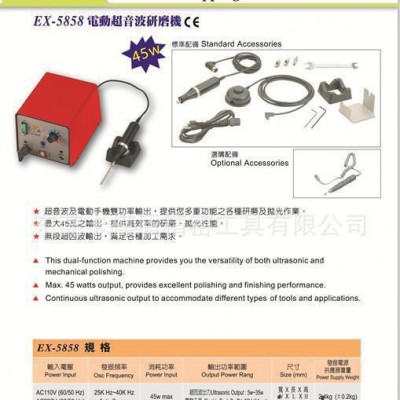 EX-6868 雙功能強力型超音波研磨機 - 80W ■ 超音波 / 電動旋轉(zhuǎn)雙功能型,雙插座可分開使用 ■ 超強 80瓦輸出功率以每秒約40,000高速音波震動. 效率快,大幅縮短研磨拋光時間 ■ 超音波的震動力道較氣動銼磨機小, 可用於各種模具的細(xì)部及特殊形狀之加工, 尤其使用於寶石加工及電子類模具更為合適, ■ 每組加附手工具機座.