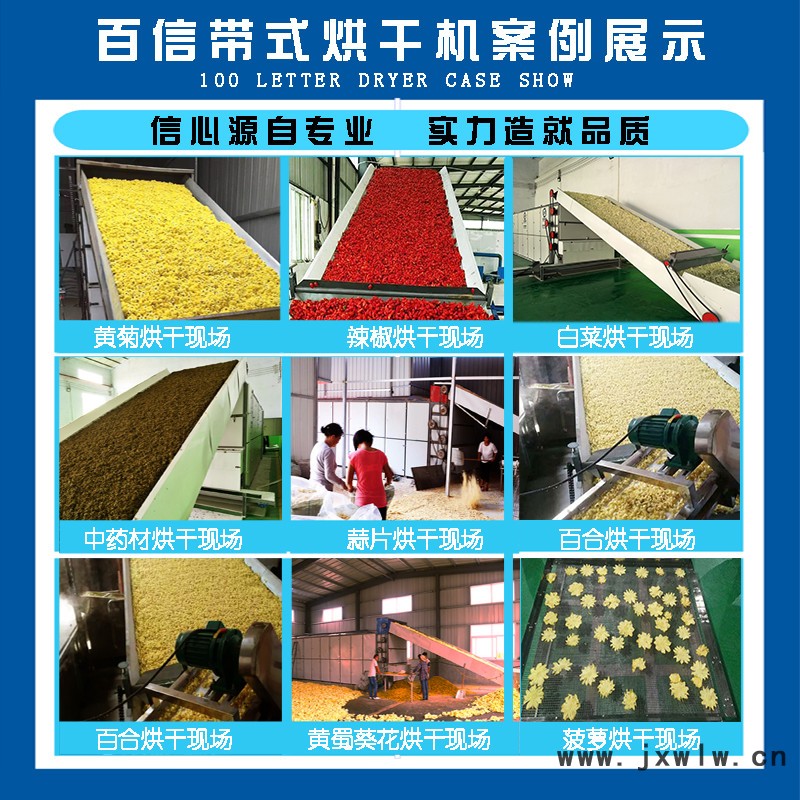 網(wǎng)帶式烘干機廣泛應(yīng)用于食品(如面條、面皮)、干果(大棗、巴旦木、腰果、開心果)、花茶(玫瑰花、菊花、金銀花、百合花)、農(nóng)副產(chǎn)品(如玉米、花生烘干袪潮)、脫水蔬菜(如大蒜、姜片、辣椒、辣根、洋蔥、蘿卜、生姜、小香蔥、辣根、菠菜)、瓜果(如木瓜、薯片、山楂片、葡萄干、哈密瓜)、中草藥、(連翹、黃蜀葵、枸杞、)水產(chǎn)品、土特產(chǎn)品、飼料及化工原料等加工之片狀、條狀、塊狀和顆粒狀物料的脫水干燥作業(yè)。