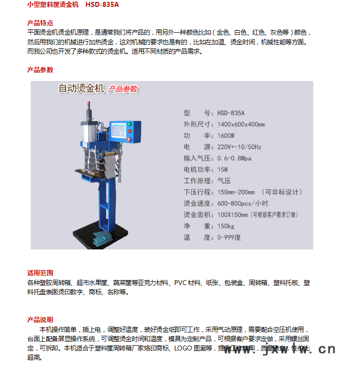 適用范圍:塑料周轉(zhuǎn)箱,塑料托盤,各種塑膠材料、亞克力材料、PVC材料的燙金熱轉(zhuǎn)印。
