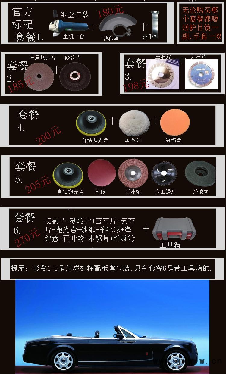 顏色分類 | 1.調(diào)速角磨機(jī)標(biāo)配 4調(diào)速角磨標(biāo)配+汽車拋光打磨套 3.調(diào)速角磨+玉石片和云石片一 2.調(diào)速角磨機(jī)+切磨片各一個(gè) 6.調(diào)速角磨+全套+工具箱一個(gè) 5.調(diào)速角磨機(jī)+木工套餐 |