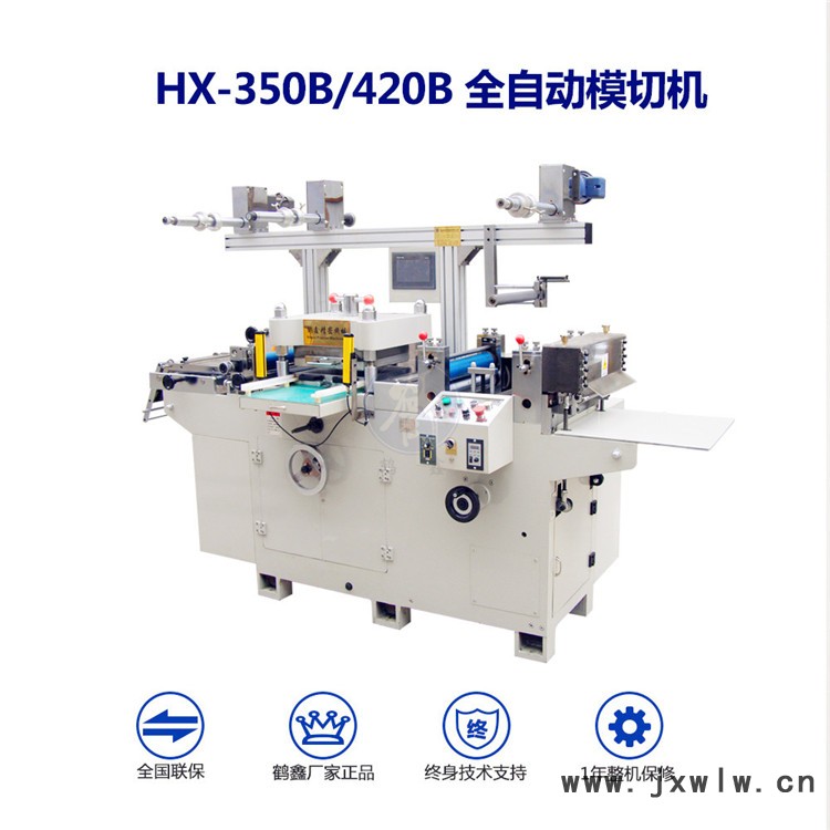 HX-350B/420B 全自動(dòng)模切機(jī)集多層貼合、局部貼合,放料-覆膜-模切-排廢-切片-收卷由電腦控制一次性完成。