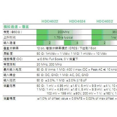 ● 12-bit ADCs 垂直分辨率,增強(qiáng)分辨率模式下達(dá)到15-bit ● 200MHz, 350MHz, 500MHz, 1GHz 帶寬分布 ● 長存儲(chǔ)-最高至50Mpts/通道 ● 12.1”觸摸顯示屏,1280×800分辨率 ● 多語言用戶界面 ● WaveScan-高級(jí)搜索和查找工具 ● LabNotebook 歸檔和報(bào)告生成工具 ● 歷史回放模式-波形回放和測量 ● 專業(yè)的頻譜分析軟件 ● 功率信號(hào)分析軟件包 ● 串行數(shù)據(jù)觸發(fā)和解碼 HD4096 高分辨率技術(shù) HD4096 高分辨率技術(shù)包含高采樣率的ADCs,高信噪比的前置輸入放大器和低噪聲的系統(tǒng)架構(gòu)。使用HD4096 技術(shù)的示波器可以精確采集和測量高達(dá)1GHz帶寬、高采樣率和比傳統(tǒng)8-bit示波器高達(dá)16倍的垂直分辨精度。 長存儲(chǔ)深度 最高至 50 Mpts 存儲(chǔ)深度的HDO4000系列高分辨率示波器可以高精度的捕獲大量的數(shù)據(jù)信息,以作為后期處理的依據(jù)。結(jié)合2.5GS/s和 50 Mpts存儲(chǔ)深度的架構(gòu)令您在長時(shí)間采集和快速脈沖捕獲都游刃有余。 超 大 1 2 . 1”觸 摸 屏 幕 HDO4000上使用了12.1”超大的觸摸屏設(shè)計(jì),使示波器上復(fù)雜的用戶操作界面已經(jīng)成為了過去。同時(shí)示波器上的用戶界面專為觸摸屏幕和鼠標(biāo)操作而設(shè)計(jì),而使示波器的操作變得異常簡單,即使沒有使用過力科示波器的用戶也能夠輕松上手!因?yàn)椴徽撌峭ǖ馈r(shí)基、觸發(fā)還是自動(dòng)化測試都可以一觸完成! 更為靈巧的尺寸