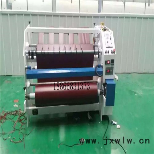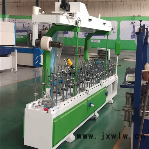 本機(jī)是將膜包覆在平面板材上的設(shè)備。其原理是將膜通過(guò)刮膠系統(tǒng)上膠后用壓覆輪壓合在板材表面上。設(shè)備包含進(jìn)料壓輥、毛刷和吹風(fēng)除塵、基材加熱、單卷放膜、刮膠系統(tǒng)(根據(jù)客戶要求選擇)、主壓覆裝置、電器控制組成