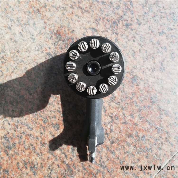 氣動(dòng)打號(hào)機(jī)用風(fēng)管和接頭與壓縮空氣相連,壓力達(dá)到0.6-0.8Mpa時(shí)即可使用,操作時(shí),將字碼轉(zhuǎn)盤的某字轉(zhuǎn)至正上方后,扣動(dòng)板柄即可實(shí)現(xiàn)。
