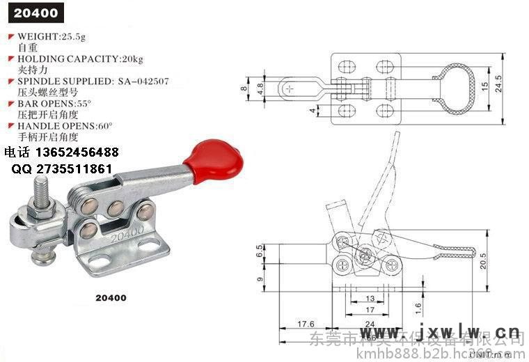 【型號(hào)】 20400:夾持力20KG;壓把移動(dòng)55°;把手移動(dòng)60°。