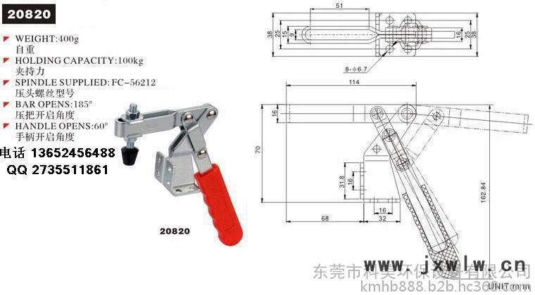 【型號(hào)】 20820:夾持力100KG;壓把移動(dòng)185°;把手移動(dòng)60°。