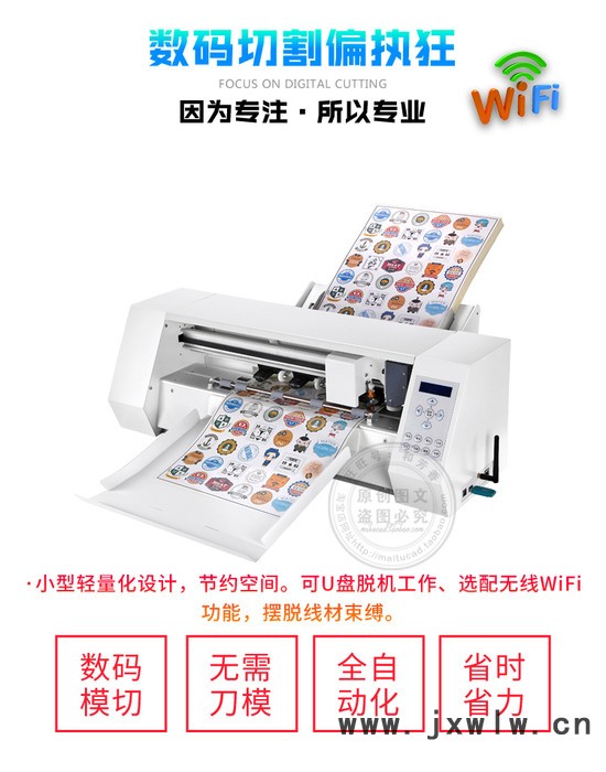 可以調節(jié)電眼靈敏度,以適應不同顏色紙張。800克切割壓力,以支持不同材料,重復切割可以達到+—0.1mm的精度。本機器采用CDR插件直接排版切割,無需轉到第三方輸出軟件。