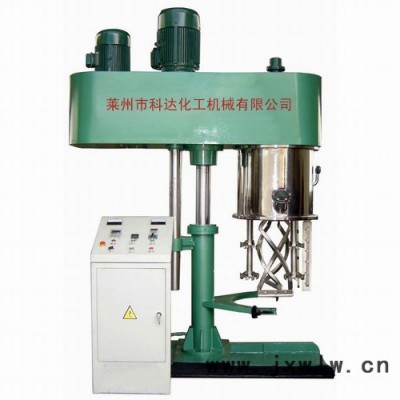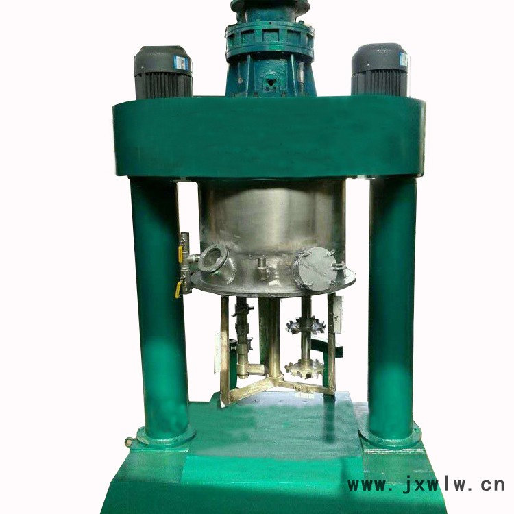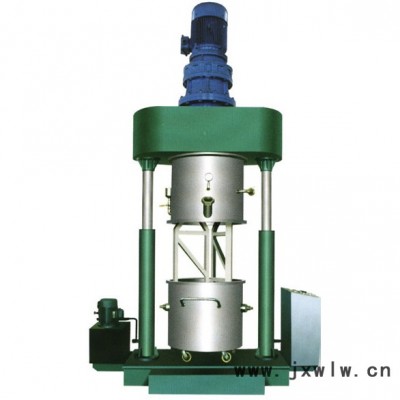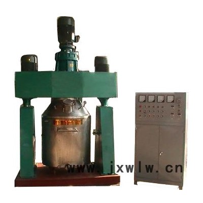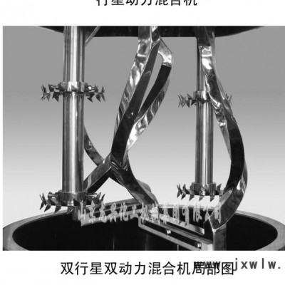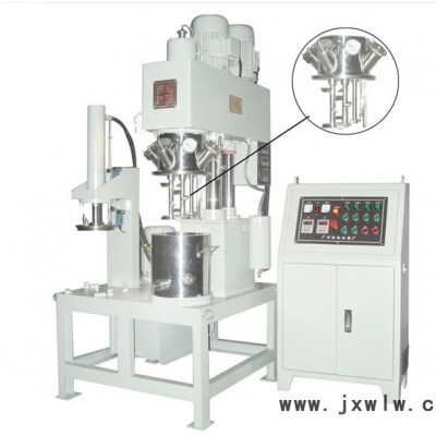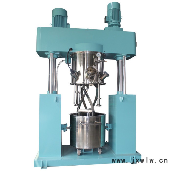 此款攪拌機有三個主電機,攪拌釜內有三根不同形式的攪拌器,其中一個攪拌器在繞釜體軸線轉動,其余兩個攪拌裝置又以不同的轉速,繞自身軸線高速自轉,使物料在釜內作復雜的運動,受到強烈的剪切和搓合。機器設備內山形刮刀繞釜體軸線轉動,將粘在壁上和底部的原料刮出,使其效果更為理想。設備密封性好,可抽真空,具有良好的排氣除泡效果。設備缸蓋可液壓升降,缸體可自由移動,操作十分方便。攪拌器的形式,根據物料要求可為多層槳葉式、框式、蝴蝶式、葉輪式等。通常采用變頻調速,以滿足各種工藝要