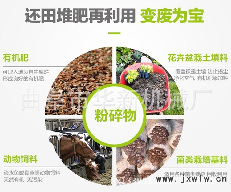 集切片、粉碎為一體,可切屑直徑1--20公分的枝杈及枝干,還可用于竹、茅草、玉米稈、高粱稈等纖維質(zhì)稈狀物料的切屑。