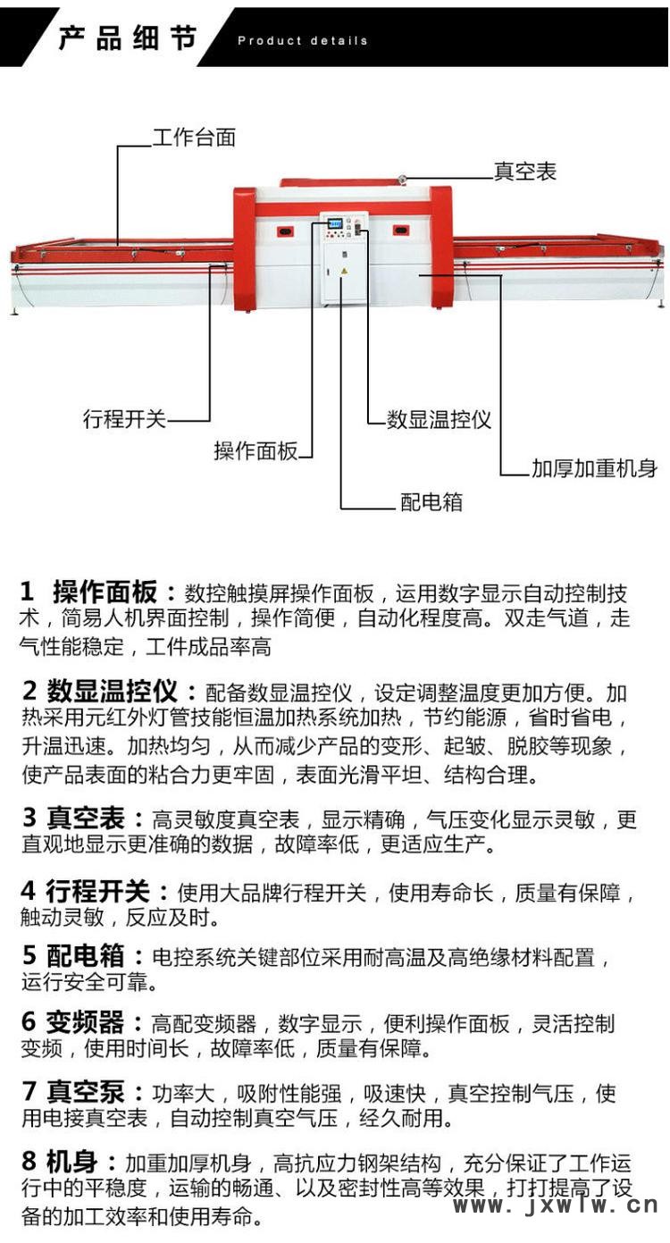 本設(shè)備可將各種PVC膜在家具、櫥柜、音箱、免漆門(mén)等各種材料上進(jìn)行三維貼覆??杉友b硅膠板后用于熱轉(zhuǎn)印膜和單面實(shí)木單板的貼覆。