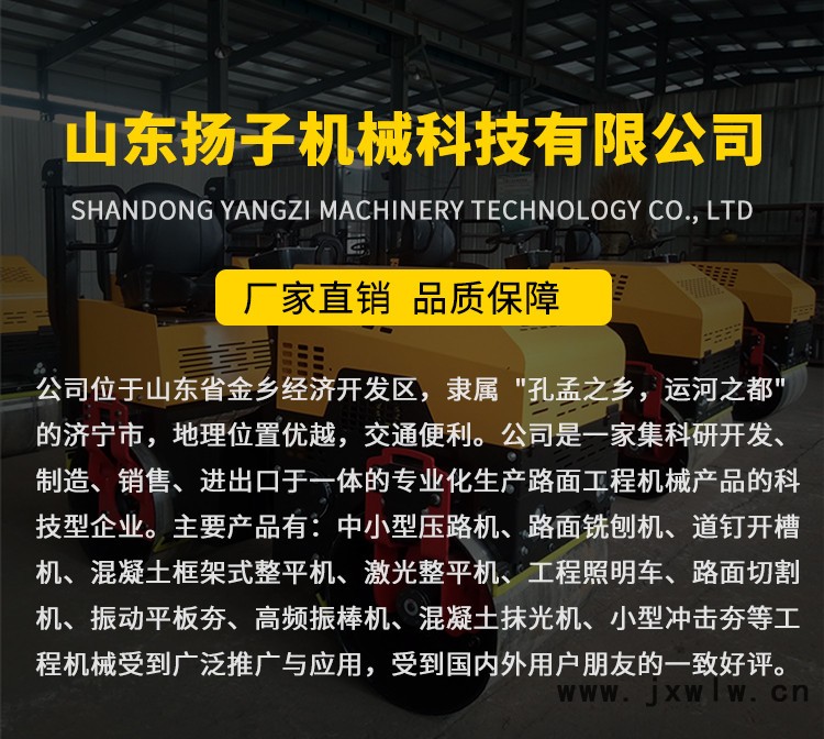 山東揚子機械科技有限公司位于中國四大工程機械制造基地之一的山東省濟寧市。 公司主要從公司位于山東省金鄉(xiāng)經(jīng)濟開發(fā)區(qū),隸屬 "孔孟之鄉(xiāng),運河之都" 的濟寧市,地理位置優(yōu)越,交通便利,公司是一家集科研開發(fā)、制造、銷售、進出口于一體的專業(yè)化生產(chǎn)路面工程機械產(chǎn)品的科技型企業(yè)。主要產(chǎn)品有:中小型壓路機、路面銑刨機、道釘開槽機、混凝土框架式整平機、激光整平機、工程照明車、路面切割機、振動平板夯、高頻振棒機、混凝土抹光機、小型沖擊夯等工程機械。受到廣泛推廣與應(yīng)用,受到國內(nèi)外用戶朋友的一致好評。