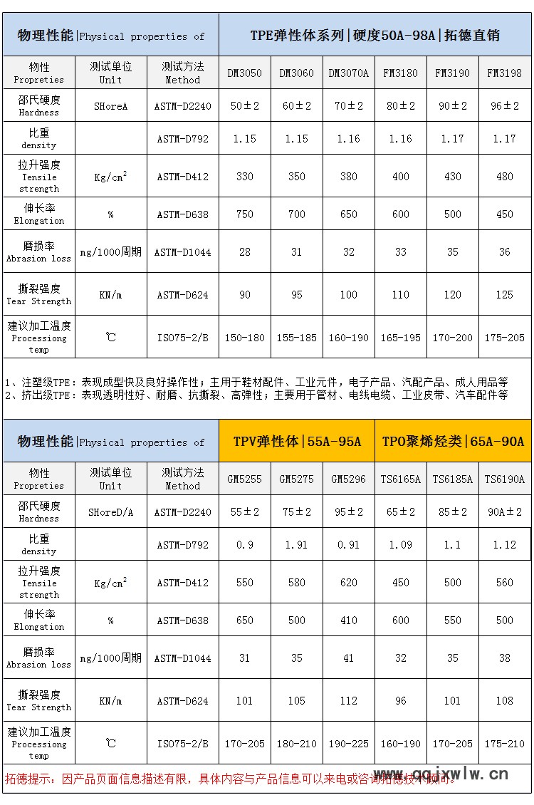 拓德全程提供詳細TPV、TPR、TPO、TPVE、TPU、PA12彈性材料產(chǎn)品資料。