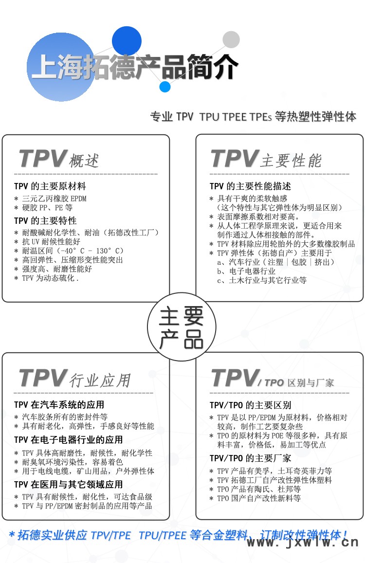 產(chǎn)品頁(yè)面信息展現(xiàn)有限,敬請(qǐng)理解,拓德為TPV【生產(chǎn)商 | 經(jīng)銷商】彈性體廠家。 拓德工廠生產(chǎn)改性TPVS、TPVE、TPU、TPV、PA12原料訂制,價(jià)格優(yōu)惠,品質(zhì)經(jīng)營(yíng)!