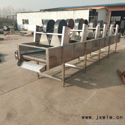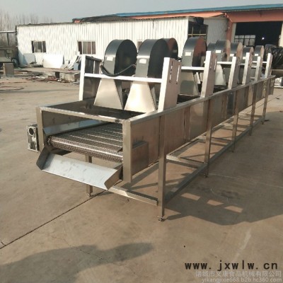 物料通過網帶傳輸進入,經多次翻轉,以實現(xiàn)物料的多面受風及受風的均勻性,通過離心風機的高壓風力將食品冷卻或將表面水分吹干,風嘴成風刀狀,有效地提高了風量壓力,使物料表面的水分在短時間內吹走或蒸發(fā),便于儲藏或深加工。