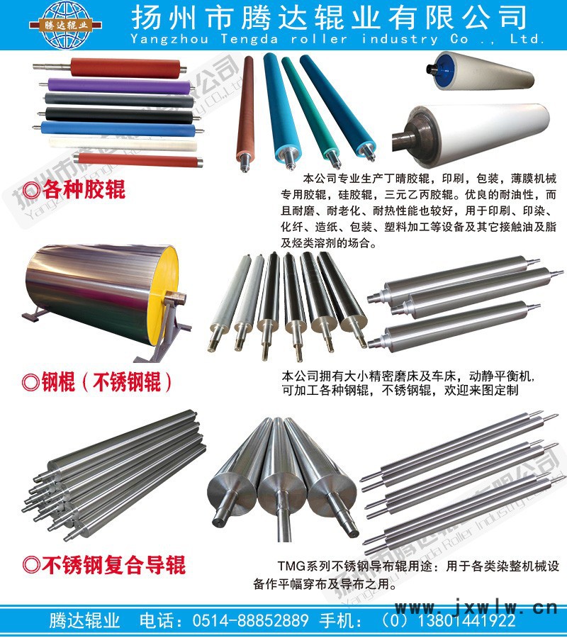 本公司生產(chǎn)各種膠輥,其中有丁晴橡膠,三元乙丙橡膠,硅膠,等系列橡膠制品的制作與生產(chǎn)。并承接各種膠輥包膠等業(yè)務(wù)。歡迎各位來圖加工或來我公司考察。