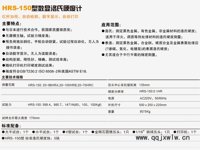 硬度值范圍 :20~88 HRA ,20~100 HRB ,20~70 HRC初試驗力:98N總試驗力:588N,980N,1471N總試驗力保持時間:1-30s硬度讀數(shù)方式:數(shù)顯硬度分辨率:0.1HR電源電壓:AC220V 50/60Hz試件允許**大高度:170mm壓頭中心到機(jī)身距離:135mm硬度計外形尺寸:500×250×220 mm硬度計重量:75 kg三、主要附件