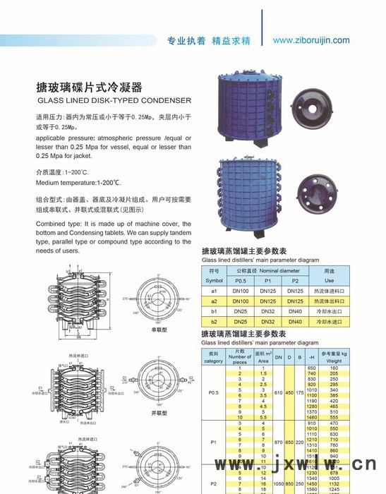 1、搪玻璃碟片式冷凝器分P1型及P0.5型兩種型號(hào)。冷凝面積P0.5型,每片為0.5平方米,設(shè)備外徑為700mm。P1型,每片冷凝為1平方米 ,設(shè)備處徑為960mm。定型規(guī)格為1.5-10平方米系列,可根據(jù)所需冷凝量來選擇。