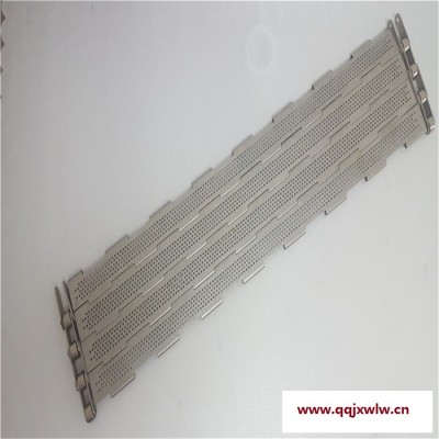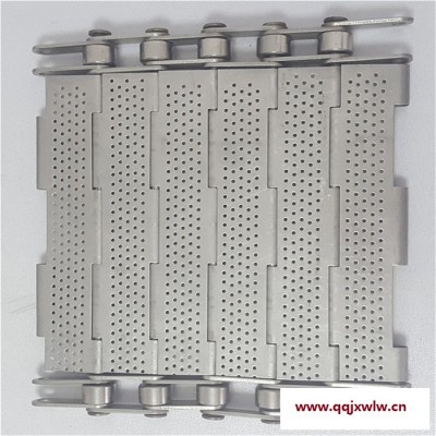 食品行業(yè)上用不銹鋼材質(zhì)的鏈板,能沖孔,能提升,能轉(zhuǎn)彎,可加橫側(cè)擋板,保證物料的安全輸送。