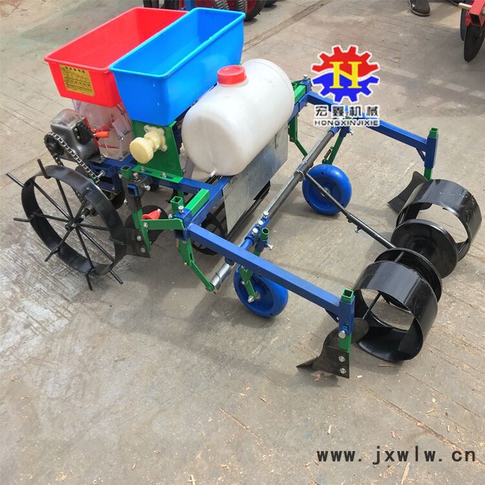 施肥播種噴藥覆膜機(jī),配套手扶拖拉機(jī)的花生播種覆膜機(jī)械。該機(jī)以其緊湊合理,功能齊全的結(jié)構(gòu)將花生覆膜種植中的筑壟、播種、覆土、噴藥、展膜、壓膜、膜上筑土等農(nóng)藝技術(shù)一次作業(yè)完成。