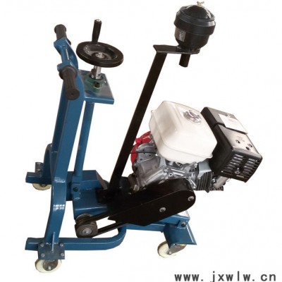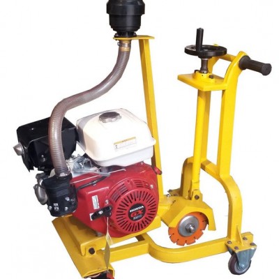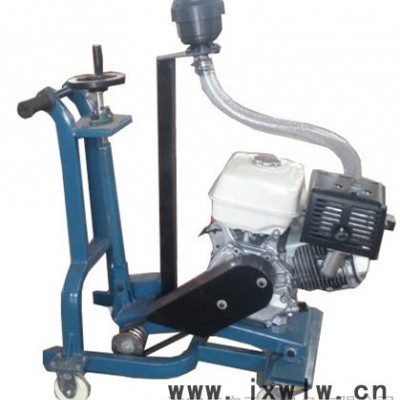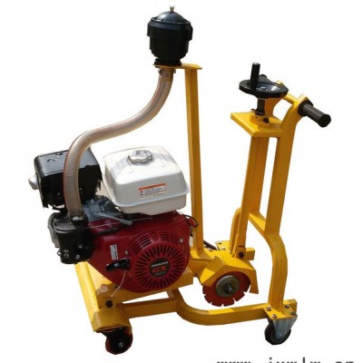 其工作原理是由動力永光的汽油發(fā)動機(jī)作為動力源,通過三角帶帶動主軸高速旋轉(zhuǎn),手搖升降手輪使主軸下降,切割裂縫,前行走輪采用萬向輪,